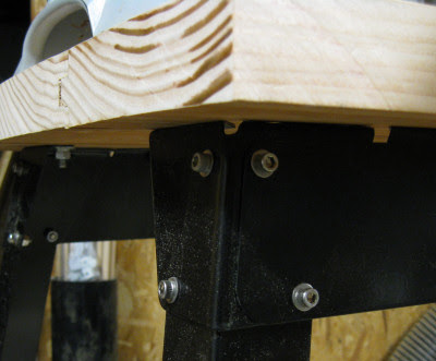 I knew from the postings that the faux wood, particle board top, attached with a few wood screws wasn't going to cut it. I fashioned a top out of 1-1/2" fir t&g flooring, using 8 carriage bolts to secure it.